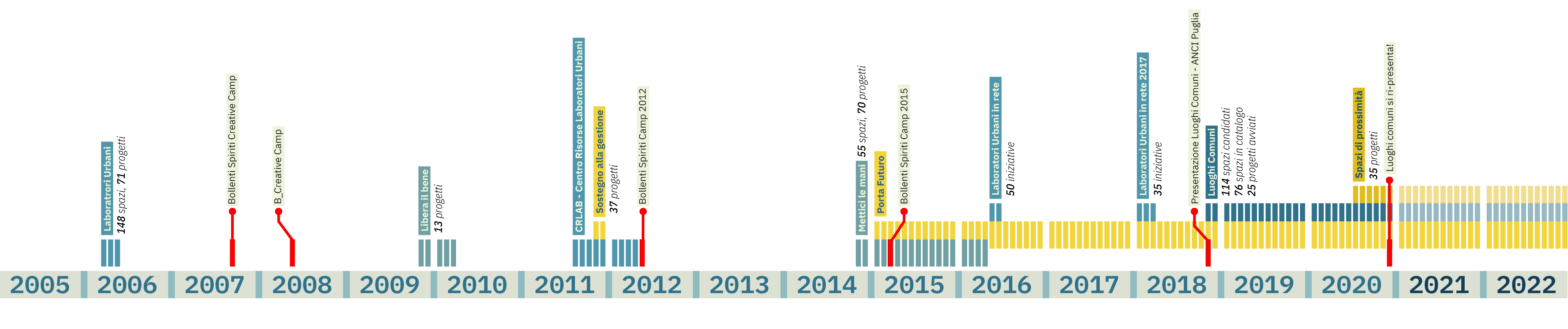 Nel corso degli ultimi 15 anni la Regione Puglia ha fortemente investito nella crescita di un ecosistema dove sviluppare esperienze di attivazione giovanile. Tra il 2008 e il 2016 con l’iniziativa Laboratori Urbani, la Regione Puglia ha finanziato la trasformazione di 150 edifici pubblici sottoutilizzati in spazi per i giovani offrendo supporto alla gestione e specifiche attività di formazione, networking e consulenza specialistica. Ogni Laboratorio nasce e si sviluppa con funzioni e vocazioni proprie (arte, spettacolo, nuove tecnologie, socializzazione,formazione, imprenditorialità, mobilità internazionale) rappresentando così un’opportunità prossima e accessibile di applicazione e consolidamento delle capacità e degli interessi dei giovani.